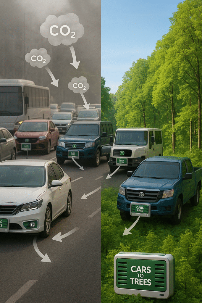 CARS TO TREES transforms everyday vehicles into mobile Direct Air Carbon Capture (DAC) systems. By harnessing the unused potential energy of cars—such as airflow, motion, and wasted heat—each vehicle becomes a decentralized air-cleaning unit capable of capturing 8–10 metric tons of CO₂ per year.